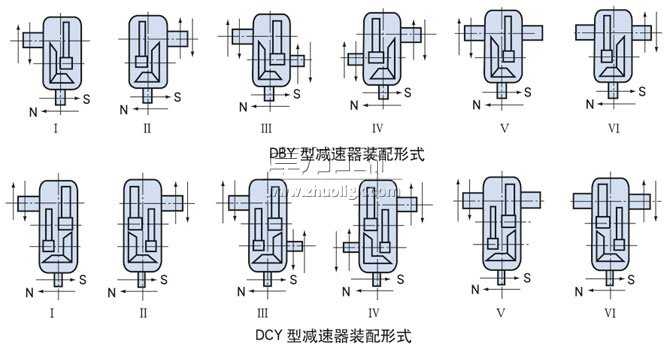 減速器按出軸形式可分為Ⅰ、Ⅱ、Ⅲ、Ⅳ、Ⅴ、Ⅵ六種裝配型式,按旋轉(zhuǎn)方向可分順時(shí)針(S)和逆時(shí)針(N)兩種方向,Ⅲ、Ⅳ、Ⅴ、Ⅵ型可裝制動(dòng)或逆制裝置。如圖。