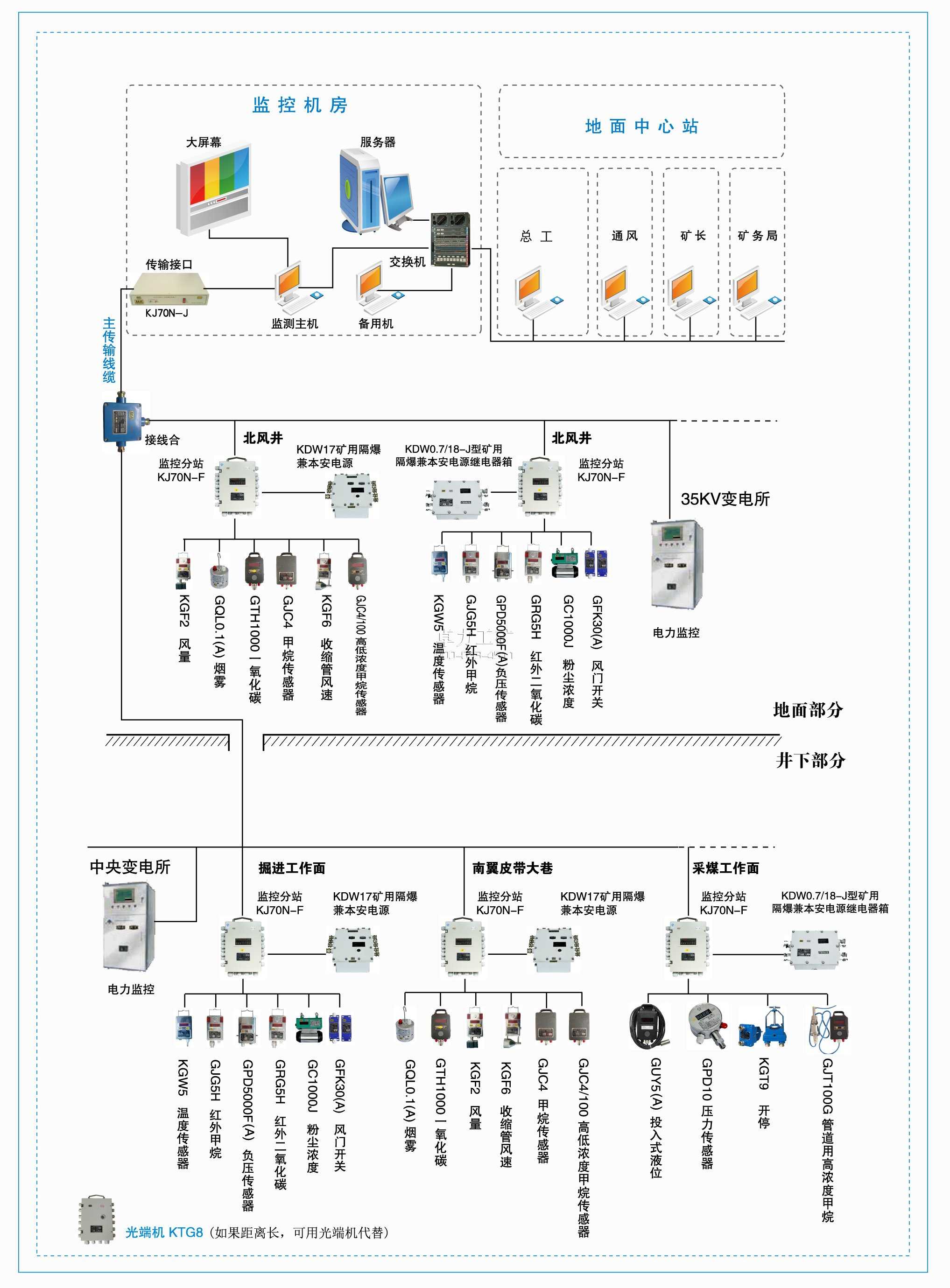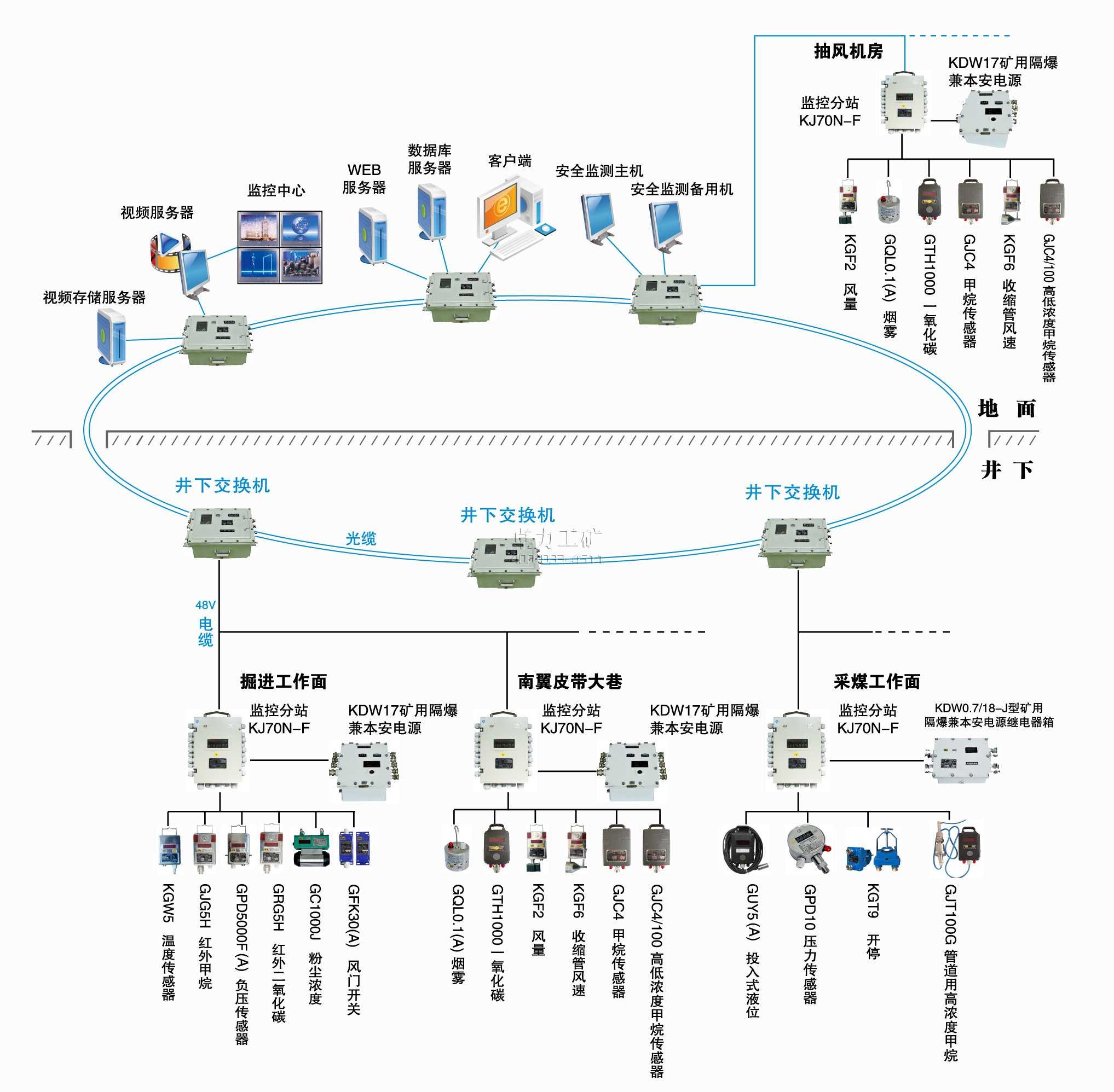 KJ70N煤礦安全監(jiān)控系統(tǒng)的設計是以《煤礦安全規(guī)程》為依據(jù),對煤礦井下實際情況進行考察之后,綜合各方面的要求設計出來的,監(jiān)控設備的種類、數(shù)量、性能符合《煤礦安全規(guī)程》的有關(guān)規(guī)定,適用各類大中小型煤礦。該系統(tǒng)可采集瓦斯、風速、負壓、溫度、一氧化碳等環(huán)境參數(shù),以及設備開停、供電狀態(tài)等生產(chǎn)參數(shù),可以控制設備的通、斷電,是煤礦安全生產(chǎn)的必備設備。