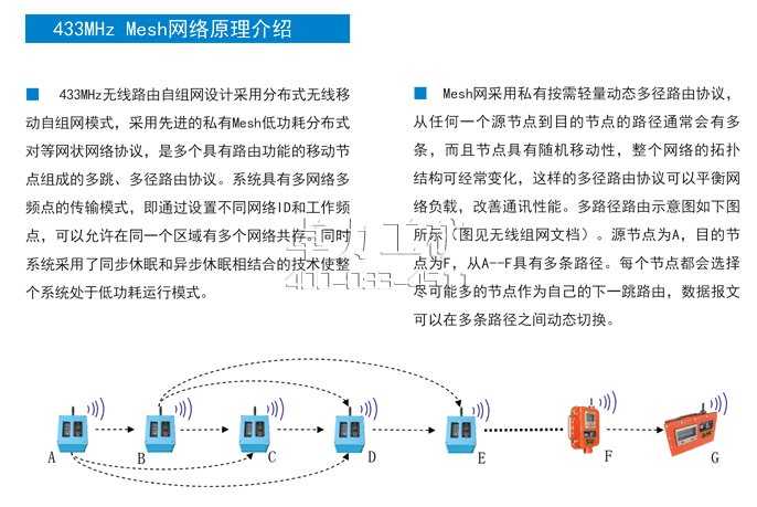 ■ 該系統(tǒng)采用國內(nèi)首創(chuàng)的“433M無線路由自組網(wǎng)模式”。各傳感器節(jié)點(diǎn)采用的是一種完全分布式、對等的無線自組網(wǎng);
