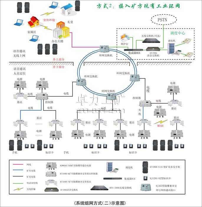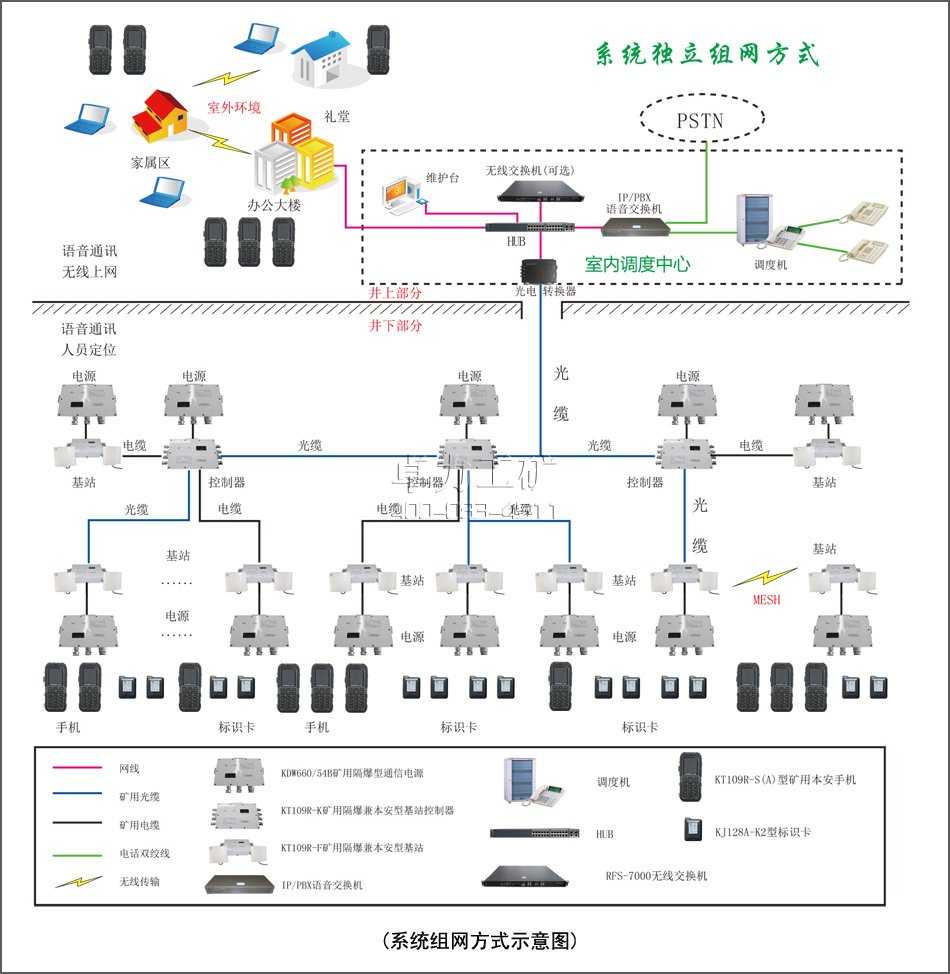 本系統(tǒng)既可接入礦方現(xiàn)有的工業(yè)環(huán)網(wǎng),又可獨立組網(wǎng)?;居泄饫|與電纜接口。當(dāng)某些基站無法布線時(如風(fēng)門),基站可采用無線接續(xù)(MESH)方式傳輸信號。