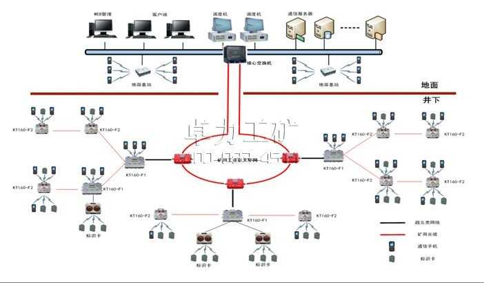 KT160礦用無線通信系統(tǒng)(以下簡稱“KT160系統(tǒng)”),是適用于對煤礦井下和井上的手機進行監(jiān)控與管理的綜合性系統(tǒng)。該系統(tǒng)通過光纖及網(wǎng)絡交換機完成地面服務器與井下設備的數(shù)據(jù)交換,通過快速的數(shù)據(jù)傳輸實現(xiàn)將井下或井上的不同基站下的手機的互聯(lián)互通,即可節(jié)約資源又方便管理,該系統(tǒng)適用于各類大、中、小型礦井。本系統(tǒng)采用統(tǒng)一標準的工業(yè)以太網(wǎng)絡架構,為人員位置監(jiān)測與管理、數(shù)字化視頻監(jiān)控、各種井下傳感器(例如:瓦斯)數(shù)據(jù)的統(tǒng)一采集與綜合處理提供了一個共用的網(wǎng)絡平臺,實現(xiàn)語音、視頻、數(shù)據(jù)的三網(wǎng)合一,為生產調度、應急救援、安全監(jiān)控與督查提供了科學手段。